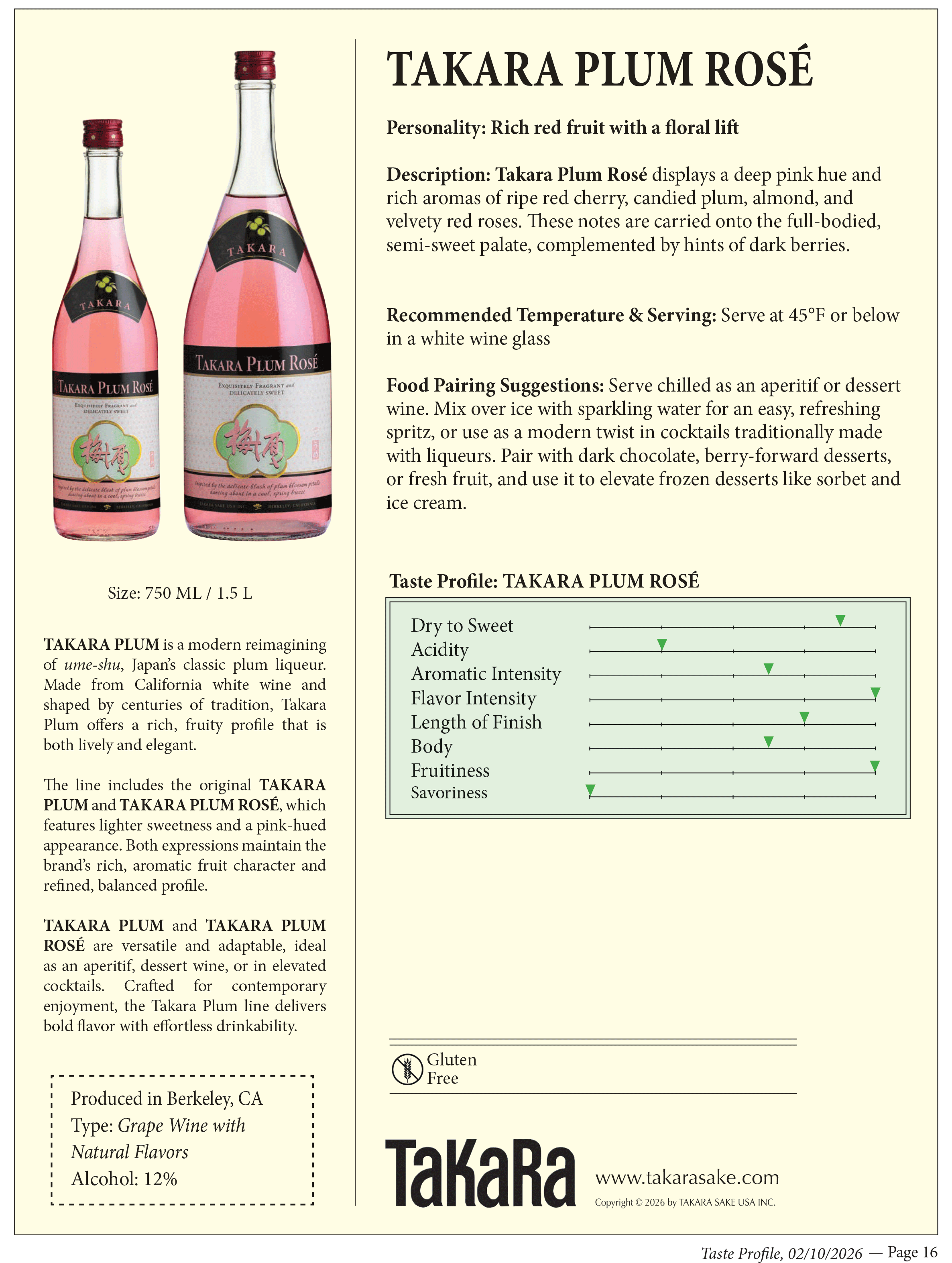 Takara Plum Rosé displays a deep pink hue and rich aromas of ripe red cherry, candied plum, almond, and velvety red roses. These notes are carried onto the full-bodied, semi-sweet palate, complemented by hints of dark berries.