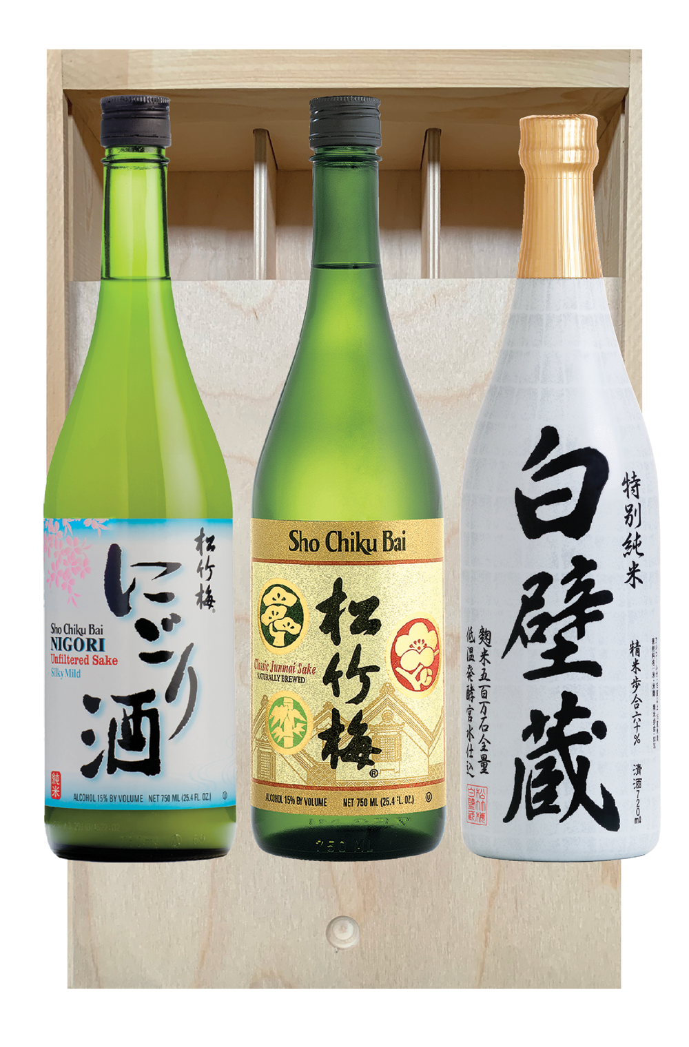 Sho Chiku Bai Nigori Silky Mild (chilled, room temperature), Sho Chiku Bai Classic Junmai (room temperature, warm), and Shirakabegura Tokubetsu Junmai Sake (chilled, room temperature, warm).